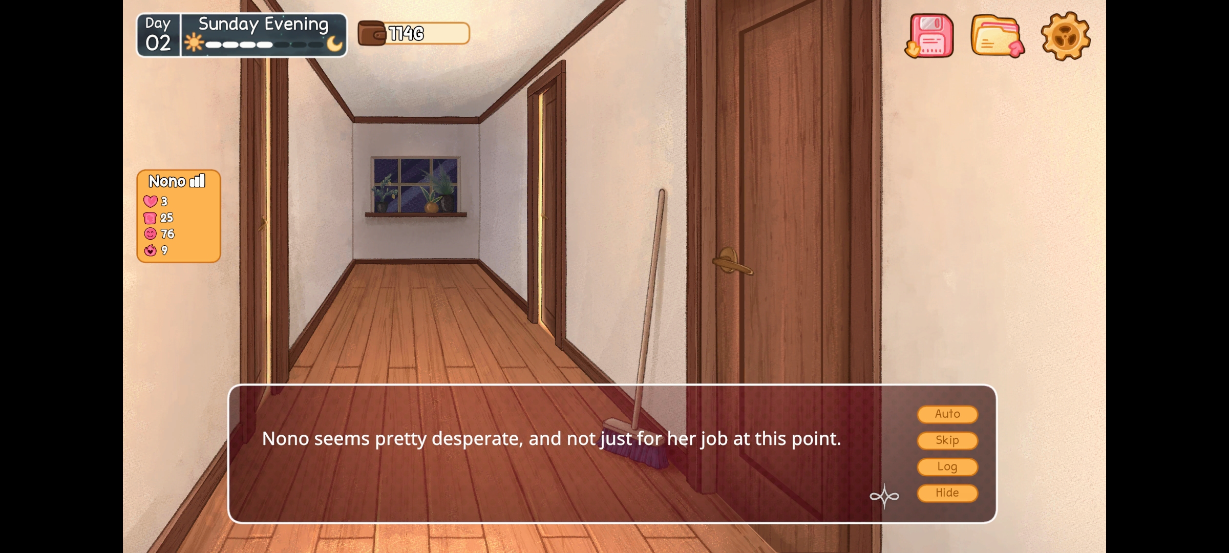 Next aspect I'd like to talk about is the gameplay. Well, at its core, the game is and stays a visual novel. You click text, there's a character on the screen that talks to you and you're reading an interactive story. Fun stuff. However, that stuff isn't anything special - clicking text while being on a one-way track to the end of the story isn't exactly what this game stands for. Nah, you have options ^^ And you got so many of them already, holy heck. I'm not even talking about dialogue options, even though those are there too and can influence the story quite significantly. No, there's, like, so much more to do than just talk in this game. You have to take care of the cleanliness of your house and yourself for example. Additionally, you are working a job - and you need it to afford food. Pair all of that with the fact that you've now got another roommate living with you, and you'll have to really think how to use your limited time during the day. Will you use it to clean up, will you spend more time with Nono and strengthen your relationship with her, or will you just go to work every day for four hours to always afford the best food there is? That choice is up to the player. Just know that no roommate likes a smelly apartment, a smelly roommate or an empty stomach :3 Oh, also, there are minigames you can play on your PC in your room - some of them you might not even necessarily play by yourself ;) But the checkers-game has been addictive ever since the first demo of this game (I believe it was in there since the start anyway) and Kuma Roll is a nice and fun little game.